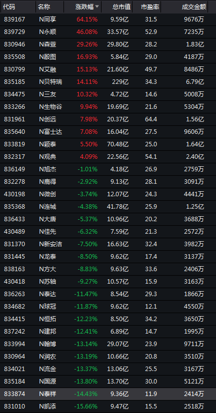 同享科技一度涨超130%,随后回落,早盘收涨64.15%。泰祥股份一度跌幅超60%,触发临停,随后又拉起跌幅收窄,早盘收跌14.43%。早盘数据显示,32家企业中,12家收涨,20家公司出现不同程度下跌。