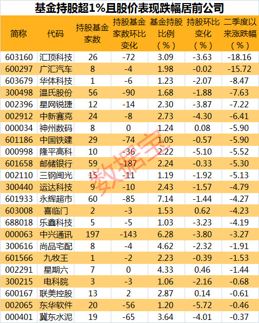 证券时报·数据宝统计显示,二季度末,基金持股占总股本比例超过1%的上市公司中,共有23股二季度以来股价出现下跌,也就是说持有这些公司的基金在这些公司上不赚反亏,大幅跑输上证指数7.11%的涨幅。