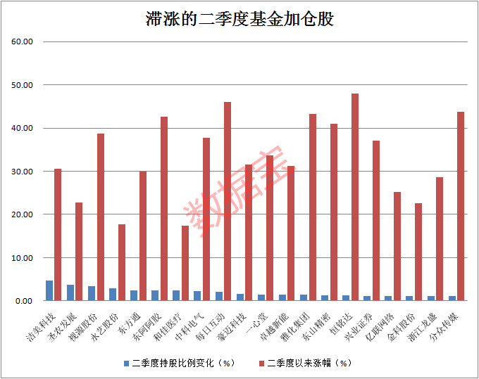 获基金增持的上市公司股价多数已处于高位,股价处于低位的公司或许值得投资者关注。数据宝统计显示,二季度以来股价上涨幅度低于50%、今年以来股价上涨幅度低于50%且基金持股比例增加1%的共有20股,如洁美科技、圣农发展、视源股份、永艺股份、东方通、东阿阿胶、和佳医疗、中科电气和每日互动等。洁美科技获基金加仓比例最大,具体值为4.69%,今年以来累计上涨35.06%。基金持股家数增加超20家的分别有东山精密、分众传媒和一心堂,东山精密二季度的持股基金数从一季度的58家增加至93家。东阿阿胶、分众传媒、东山精密、视源股份、金科股份和浙江龙盛在二季度也收获了北上资金不同程度的加仓。