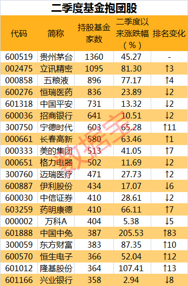 二季度基金抱团前十的上市公司分别有贵州茅台、立讯精密、五粮液、恒瑞医药、中国平安、招商银行、宁德时代、长春高新、美的集团和格力电器等,上述10股的二季度持股基金家数均超500,其中贵州茅台和立讯精密分别获1360家、1095家基金持有,是基金扎堆最多的上市公司。
