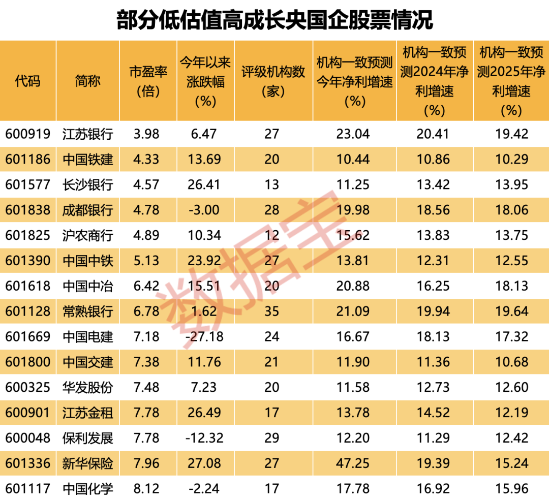 数据宝统计,评级机构数10家以上、最新滚动市盈率在10倍以下且机构一致预测今年、明年及2025年净利增速均超10%的央国企股票,合计有15只。其中,有5只千亿市值股票,包括保利发展、中国中铁、中国交建、江苏银行和中国铁建。