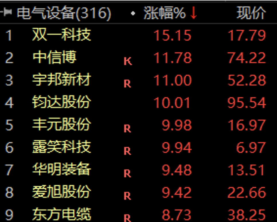 多只新能源板块大涨,双一科技、宇邦新材、中信博均大涨超10%,钧达股份、丰元股份、露笑科技等个股涨停;多只光伏权重股同样大涨,阳光电源、晶澳科技、隆基绿能、晶科能源等个股涨超3%。