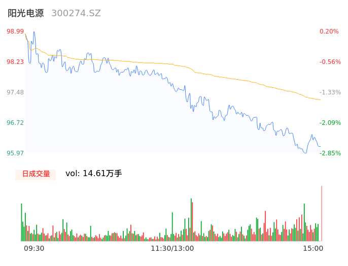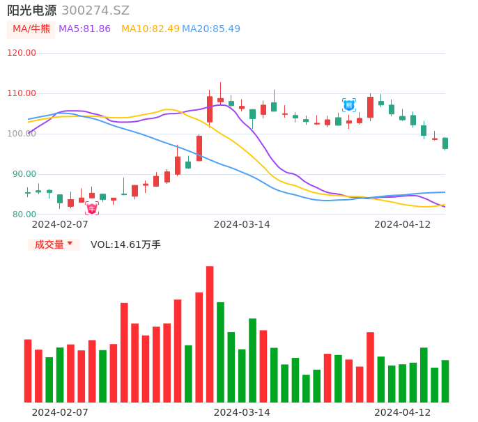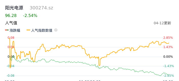 04月12日,阳光电源收报96.28,股价涨幅-2.54%,成交金额14.21亿元,换手率1.30%。