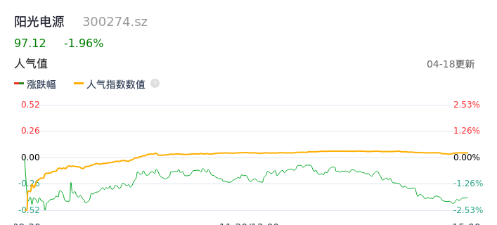 04月18日,阳光电源收报97.12,股价涨幅-1.96%,成交金额15.24亿元,换手率1.39%。