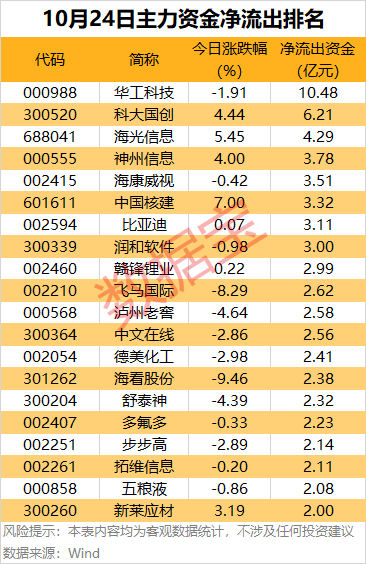 今日有67股主力资金净流出超1亿元,其中,华工科技、科大国创、海光信息、神州信息、海康威视、中国核建、比亚迪、润和软件净流出金额均在3亿元及以上。