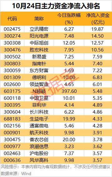 立讯精密主力资金净流入19.87亿元,居首。消息面上,阿里巴巴首款自研AI眼镜——夸克AI眼镜于10月24日零点在夸克智能设备天猫旗舰店开启预售。据IDC发布报告,随着产品形态持续创新、应用场景不断拓宽,智能眼镜有望成为下一代人机交互入口,为消费电子市场带来新增长动力。