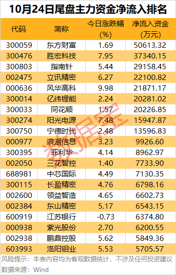 个股方面,9股尾盘主力资金净流入均超1亿元。其中,东方财富、胜宏科技、指南针、立讯精密、风华高科、亿纬锂能、同花顺7股尾盘获主力资金抢筹均超2亿元。