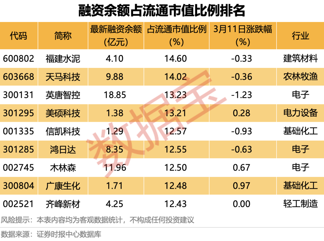 融资余额占流通市值比例最高的是福建水泥,最新融资余额为4.1亿元,占流通市值比例达14.6%。其次是天马科技、英唐智控,融资余额占流通市值比例分别为14.02%、13.23%。