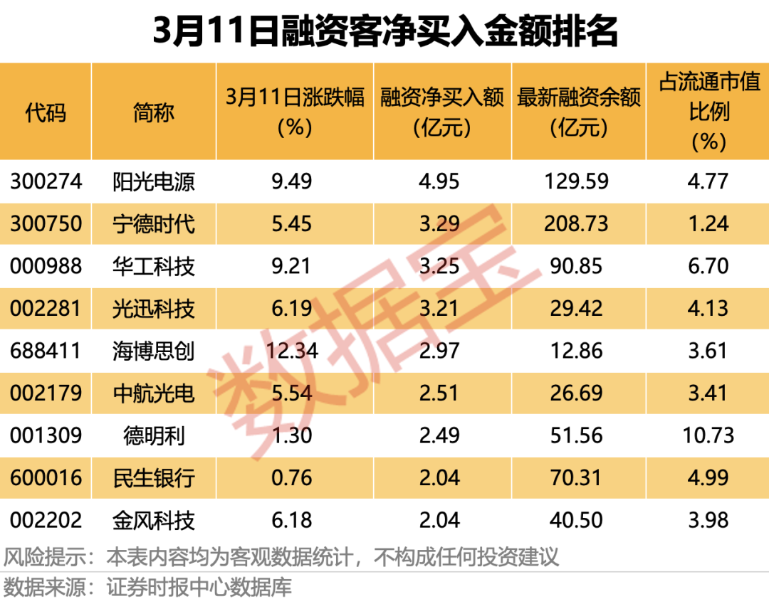 据证券时报·数据宝统计,3月11日,共40股融资净买入额均超1亿元。储能概念龙头阳光电源融资净买入额居首,当日净买入4.95亿元。