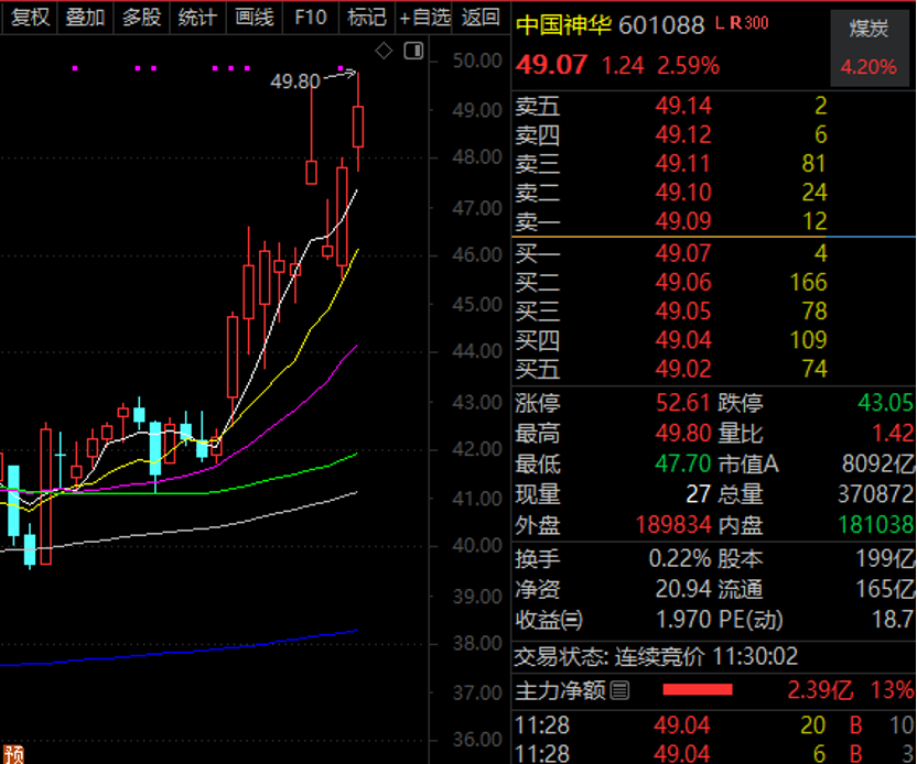 今日早盘,周期股继续大涨,煤炭指数大涨3.7%。其中,中国神华(601088)A股突破49元/股大关,再创历史新高,总市值逼近万亿元。