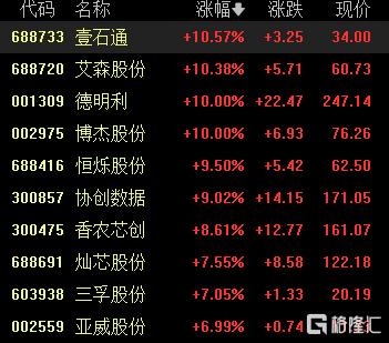 存储芯片大涨,壹石通、艾森股份涨超10%,德明利、博杰股份10CM涨停,协创数据、灿芯股份等跟涨。