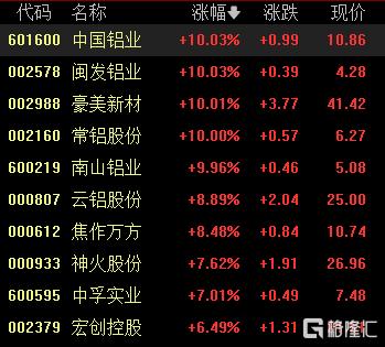 基本金属板块表现强势,中国铝业、闽发铝业、豪美新材、常铝股份、南山铝业涨停,云铝股份、焦作万方涨超8%,神火股份、中孚实业等跟涨。