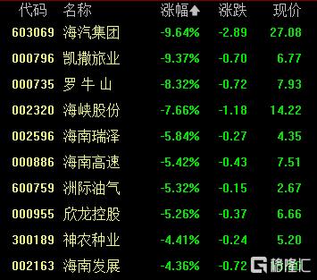 海南自贸区概念大跌,海汽集团、凯撒旅业跌超9%,罗牛山跌超8%,海峡股份跌超7%,海南瑞泽、海南高速等跟跌。