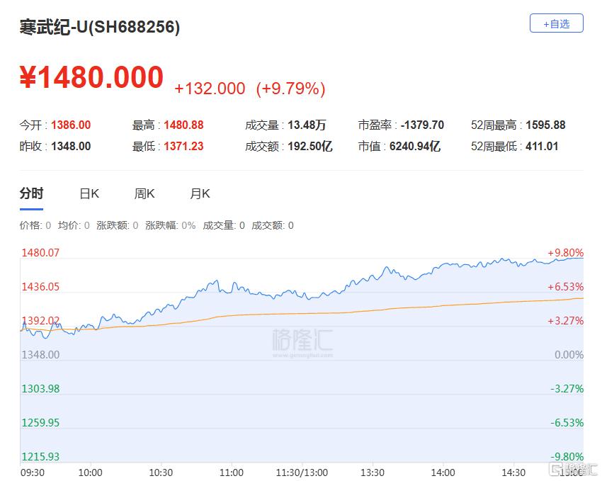 寒武纪-U收涨超9%, 股价再度超越贵州茅台,成为A股股价最高的个股。