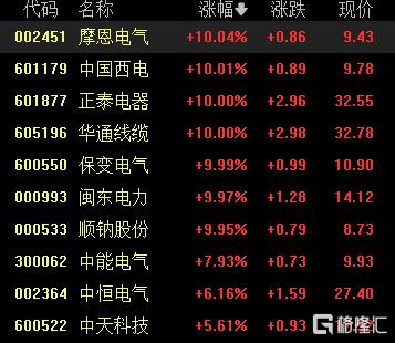 电源设备股走强,摩恩电气、中国西电、正泰电器、华通线缆、保变电气等多股涨停,中能电气涨超7%,中恒电气、中天科技等跟涨。
