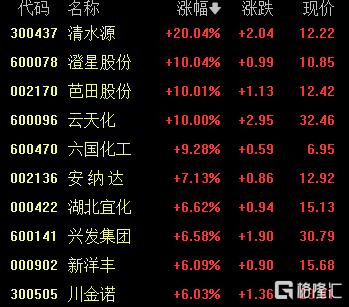 磷化工集体走强,清水源20CM涨停,澄星股份、芭田股份、云天化10CM涨停,六国化工涨超9%,安纳达、湖北宜化等跟涨。