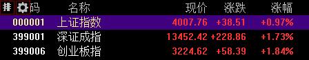 A股三大指数今日集体上涨,沪指重回4000点;截至收盘,沪指涨0.97%报4004点,深证成指涨1.73%,创业板指涨1.84%,科创50指数涨3.34%。全市场成交额2.08万亿元,较前一交易日增量1816亿元,近2900股上涨。