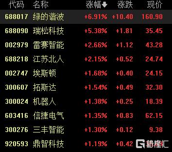 机器人概念震荡走高,绿的谐波涨超6%,瑞松科技涨超5%,江苏北人、拓斯达、信捷电气等跟涨。