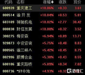 重庆股活跃,重庆建工、渝开发、神驰机电、财信发展涨停,梅安森涨超6%,渝三峡A、顺博合金等跟涨。