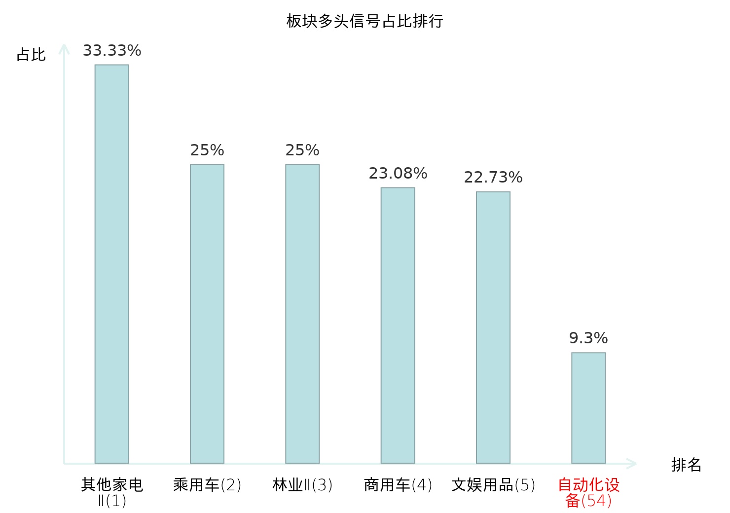 全市场所有行业板块中主力多头信号占比排名中,其他家电Ⅱ板块位居第一。林业Ⅱ板块名次提升最快,较昨日上升124位。