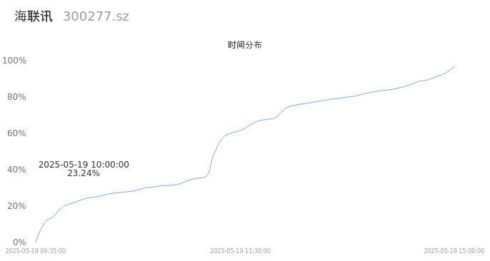 300277海联讯2025年05月19日成交20.38万手,成交金额2.67亿,相较昨日放量13.16万手,换手率6.09%,成交清淡。