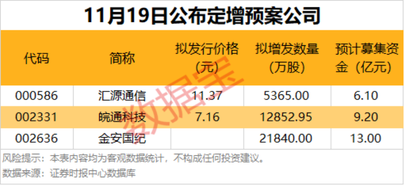 11月19日共有3家公司公布非公开发行预案。