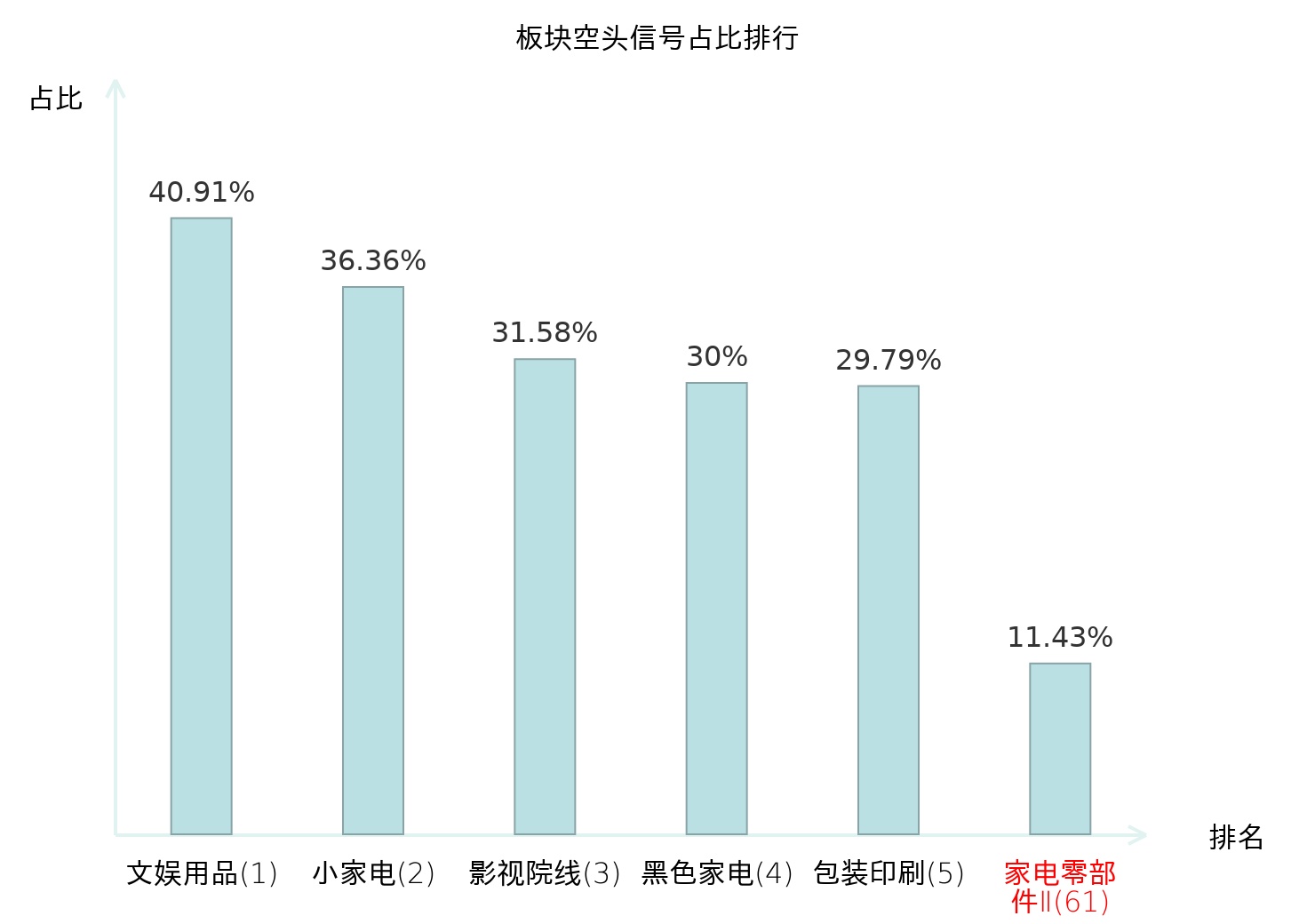 全市场所有行业板块中主力空头信号占比排名中,文娱用品板块位居第一。包装印刷板块名次提升最快,较昨日上升124位。
