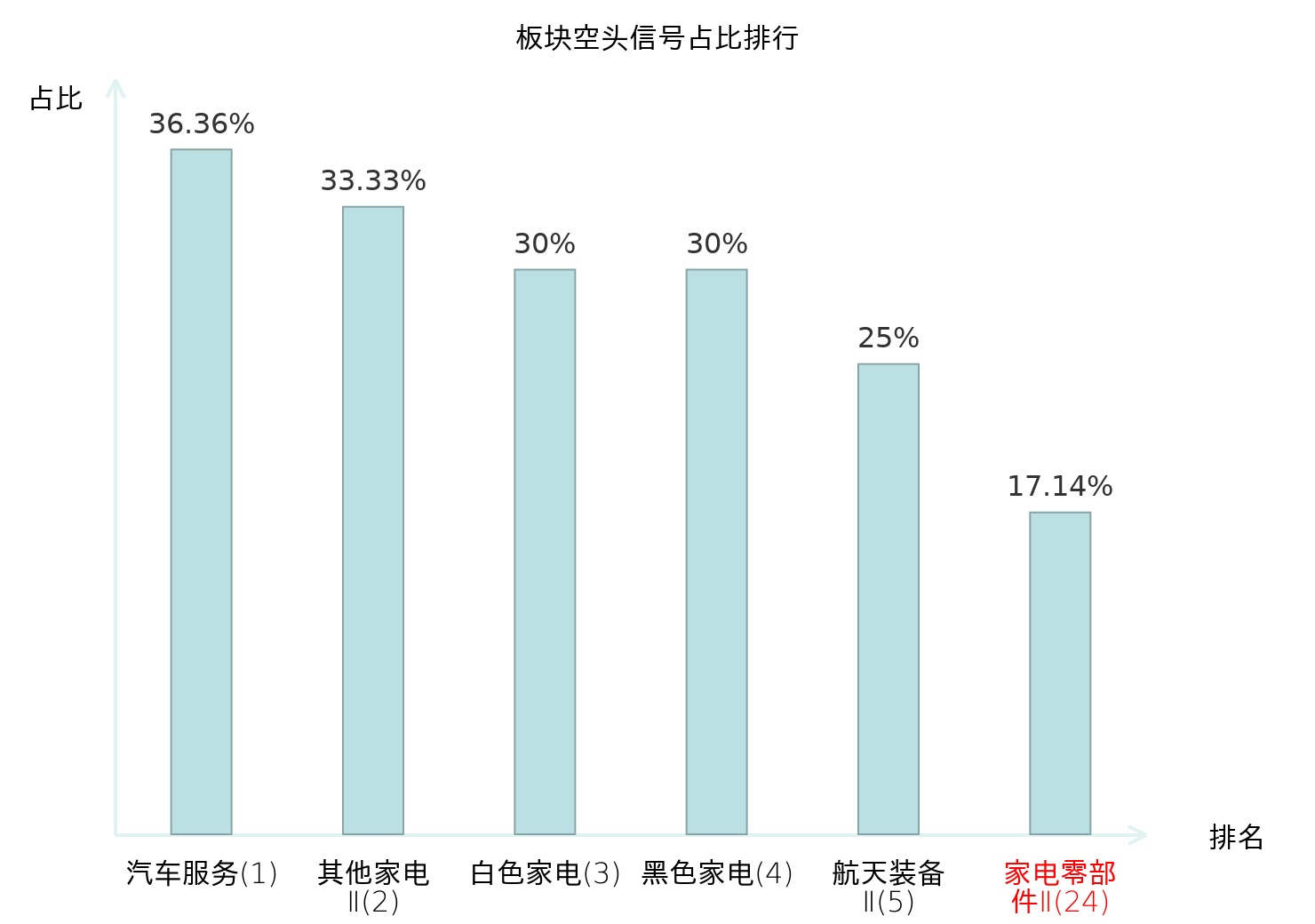 全市场所有行业板块中主力空头信号占比排名中,汽车服务板块位居第一。汽车服务板块名次提升最快,较昨日上升115位。