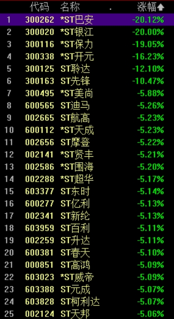 5月7日,ST板块持续大跌,截至发稿,*ST巴安、*ST银江、ST迪马、ST航高等50余只成分股跌停,*ST开元、ST聆达等跌超10%。