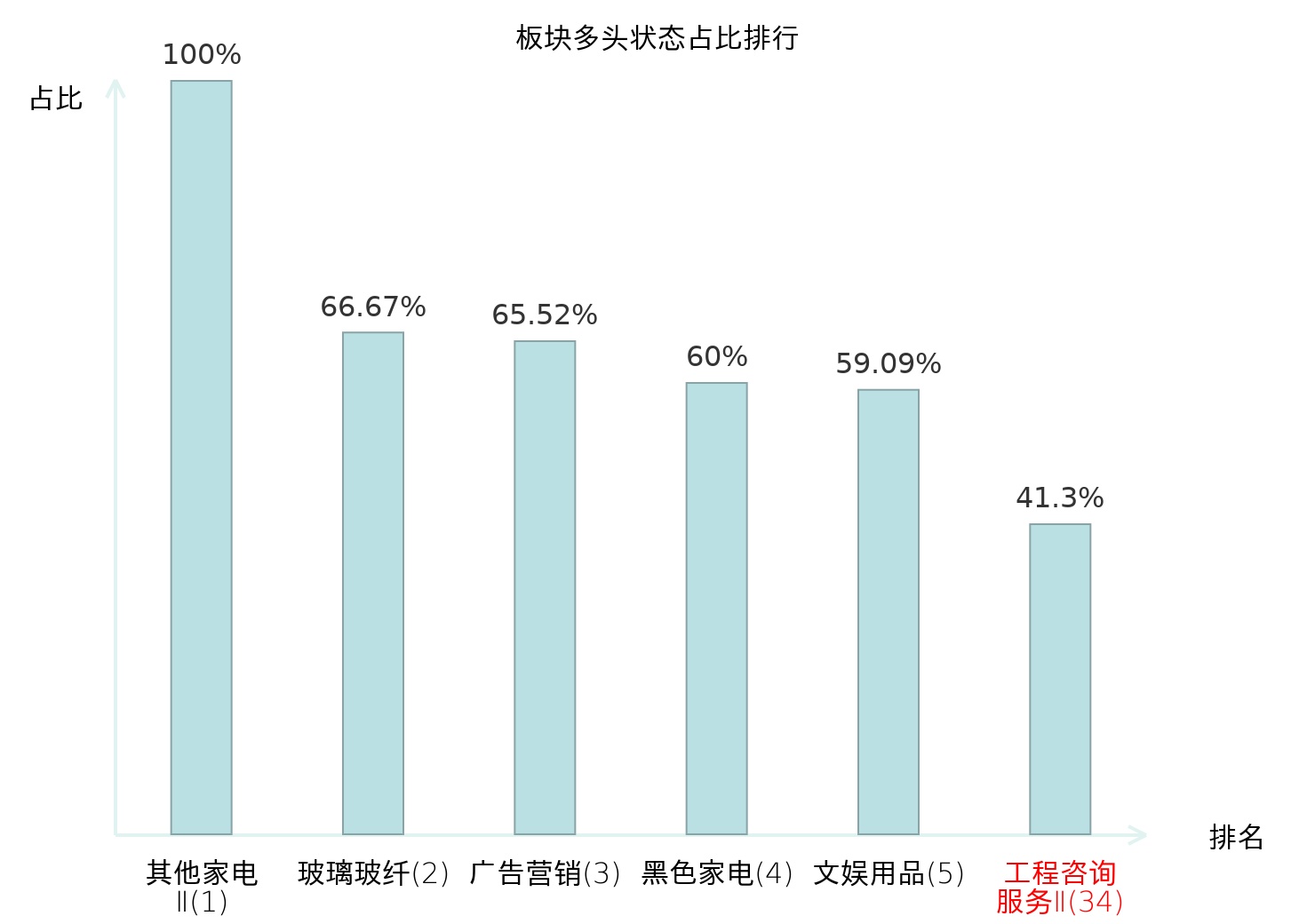 全市场所有行业板块中主力多头状态占比排名中,其他家电Ⅱ板块位居第一。体育Ⅱ板块名次提升最快,较昨日上升57位。