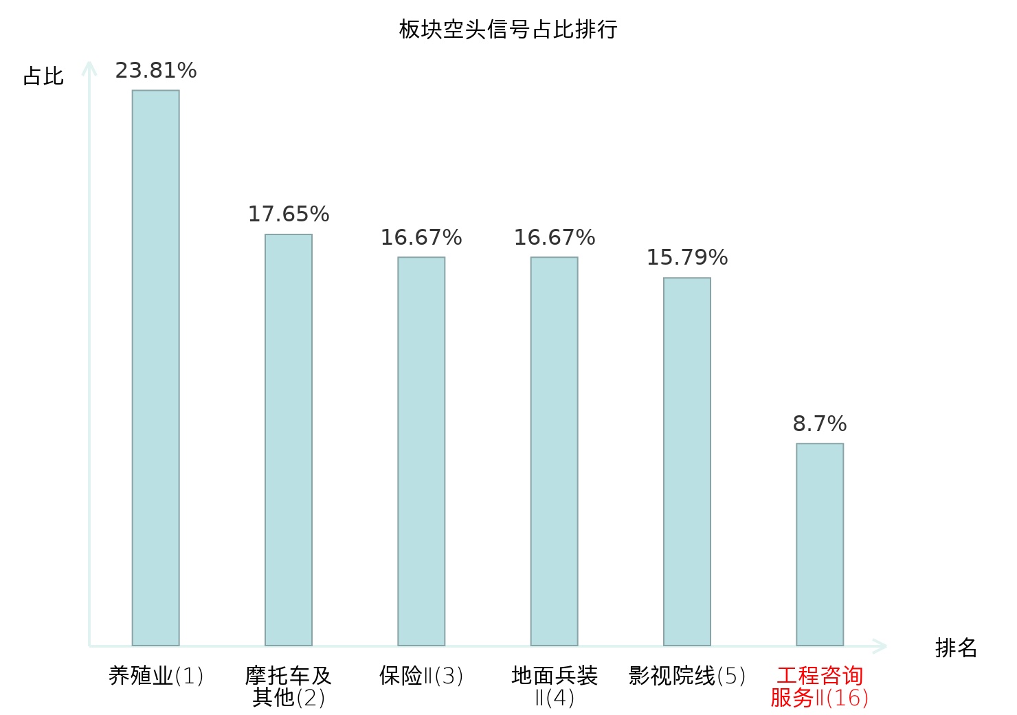 全市场所有行业板块中主力空头信号占比排名中,养殖业板块位居第一。养殖业板块名次提升最快,较昨日上升114位。