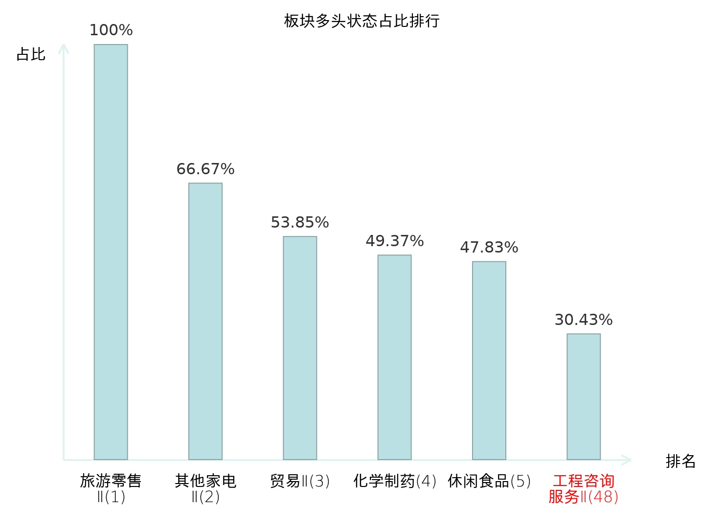 全市场所有行业板块中主力多头状态占比排名中,旅游零售Ⅱ板块位居第一。互联网电商板块名次提升最快,较昨日上升55位。