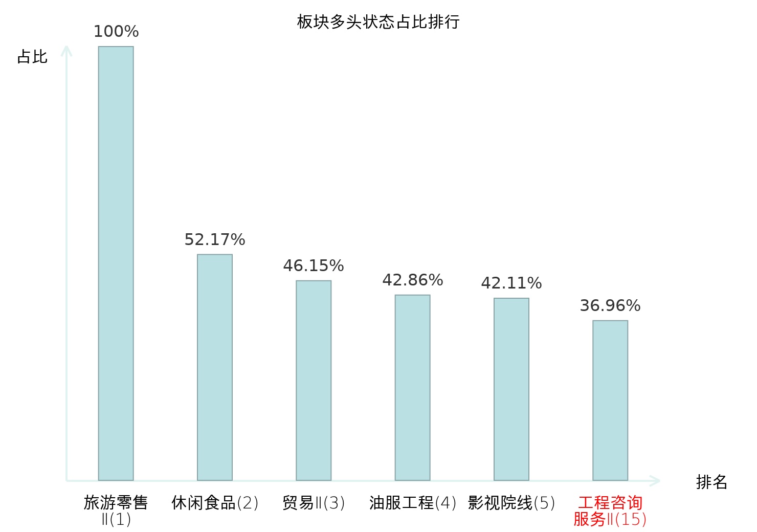 全市场所有行业板块中主力多头状态占比排名中,旅游零售Ⅱ板块位居第一。体育Ⅱ板块名次提升最快,较昨日上升99位。