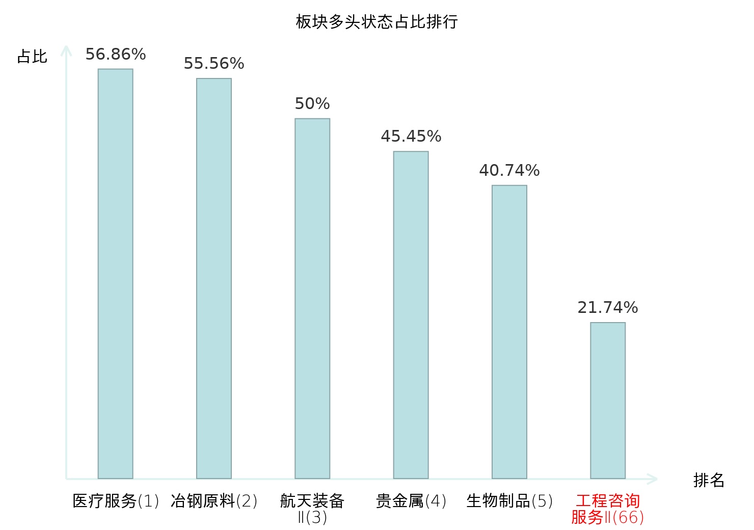 全市场所有行业板块中主力多头状态占比排名中,医疗服务板块位居第一。医疗美容板块名次提升最快,较昨日上升75位。