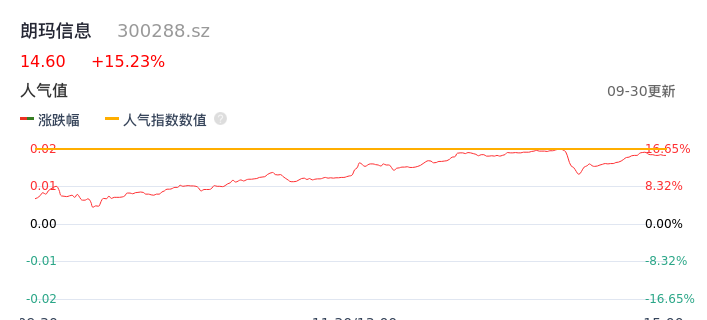 09月30日,朗玛信息收报14.60,股价涨幅15.23%,成交金额3.84亿,换手率10.75%。
