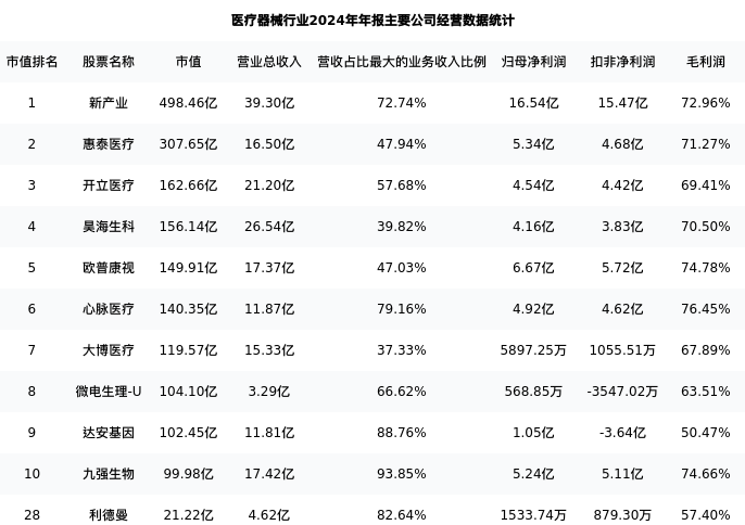 利德曼最新报告期数据为年报,下表汇总了医疗器械行业内市值靠前的公司年报主要经营数据