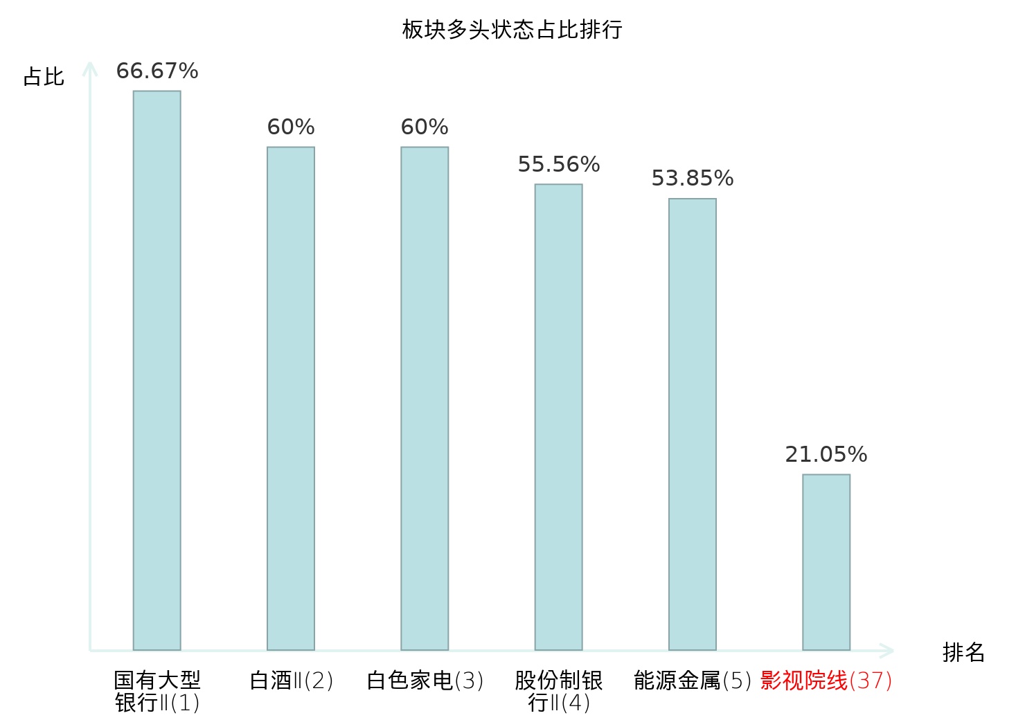 全市场所有行业板块中主力多头状态占比排名中,国有大型银行Ⅱ板块位居第一。电子化学品Ⅱ板块名次提升最快,较昨日上升55位。