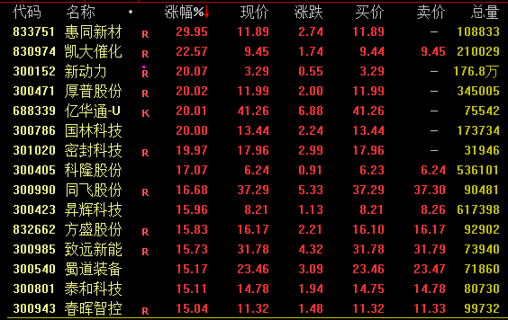 受多重利好提振,氢能源概念大幅走高,截至收盘,惠同新材、新动力、厚普股份、亿华通、国林科技、密封科技等涨停,致远新能、蜀道装备等涨超15%,雄韬股份、雪人股份、美锦能源等亦涨停。