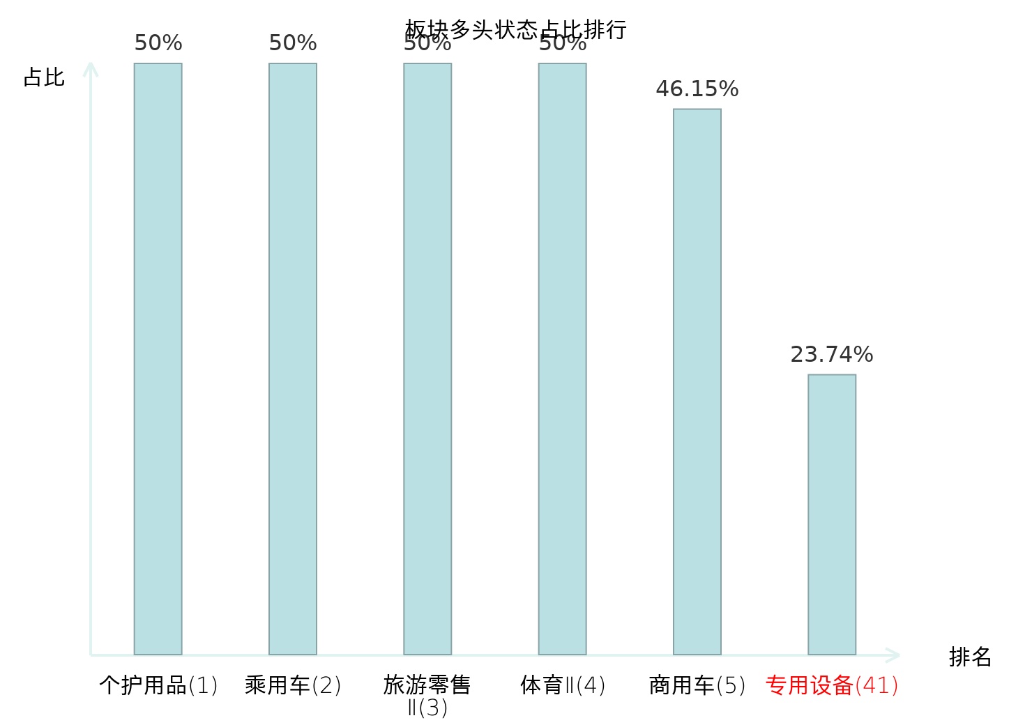 全市场所有行业板块中主力多头状态占比排名中,个护用品板块位居第一。林业Ⅱ板块名次提升最快,较昨日上升94位。