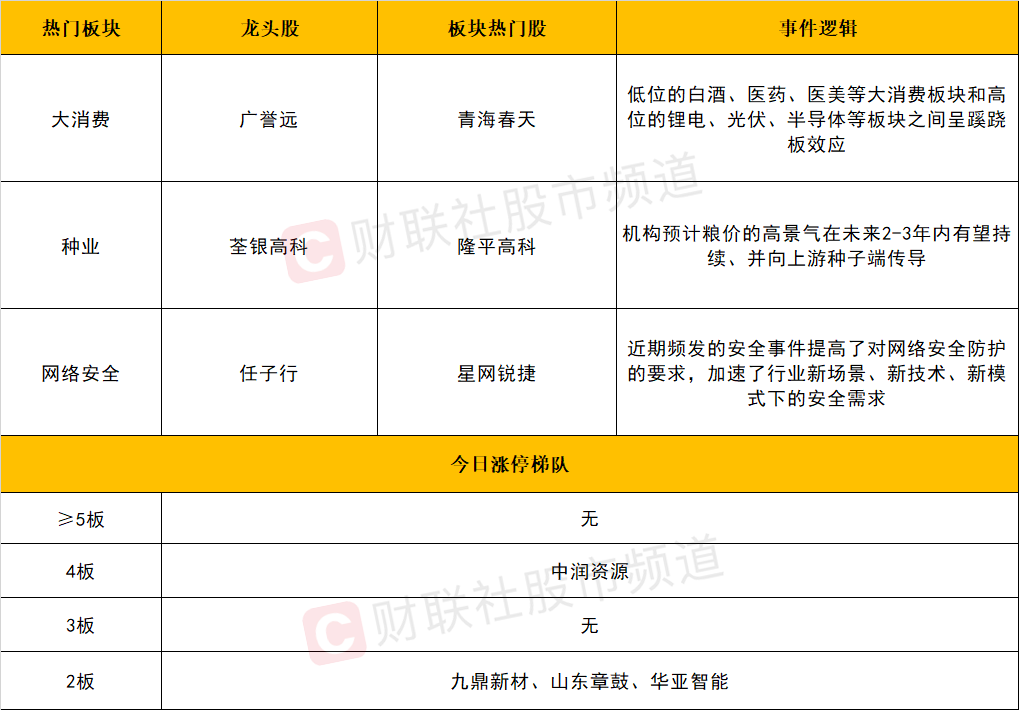 盘面上看,酒店、旅游板块拉升走高,医药、航空、农业等板块走强,保险、酿酒等板块午后回升;电力、券商、环保、钢铁、食品饮料、家电、石油等板块均走弱;种业股强势上扬,荃银高科大涨超17%,隆平高科涨停;网络安全板块再度走强,拓尔思、蓝盾股份、任子行等大涨。