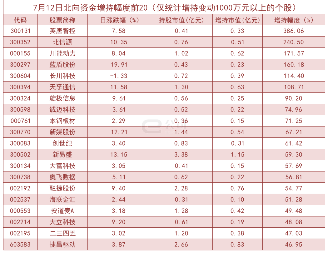 据e公司测算,增减持变动1000万元以上的个股中,英唐智控、北信源、川能动力、蓝盾股份等获北向资金大幅增持,分别为386.06%、240.50%、171.57%、160.18%。而荃银高科、晶瑞股份、苏州固锝、火炬电子等减持幅度较大,分别减持56.12%、48.83%、42.91%、36.49%。