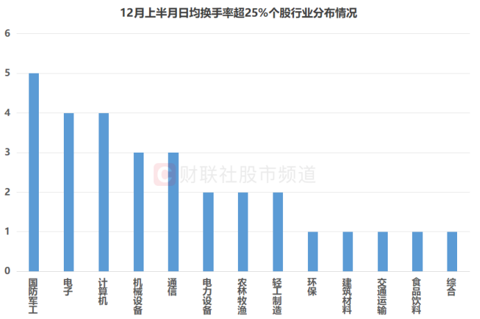 注:12月上半月日均换手率超25%个股行业分布情况(截至12月15日收盘)
