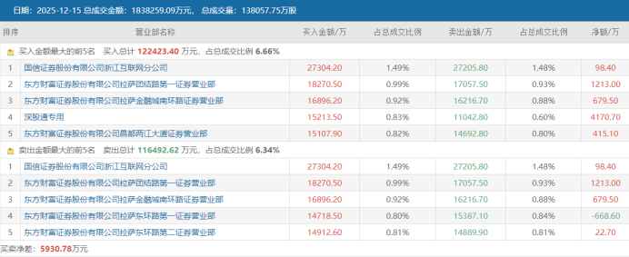 从资金面来看,平潭发展近期持续获得融资客加仓。截至12月12日,其目前融资余额规模达11.08亿元,较月初低点(12月3日)7.65亿元增长3.43亿元,增幅近44.8%。若统计其龙虎榜席位,“拉萨天团”近期频繁上榜。据其今日(三日榜)榜单显示,共有6席所属“拉萨天团”。此外,在买入榜中,另有一席为深股通席位,其净买额近4171亿元。