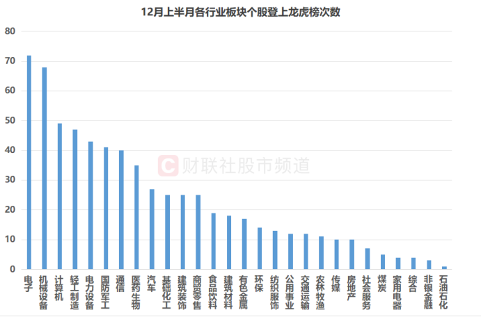 此外,从龙虎榜数据上看,截至12月12日,累计共有近310股月内登上龙虎榜单。其中,电子、机械设备、计算机、轻工制造、电力设备板块个股登榜次数较多,其分别占比近11.0%、10.4%、7.5%、7.2%、6.5%。同时,国防军工、通信、医药生物、汽车、基础化工、建筑装饰、商贸零售股月内登上龙虎榜的次数也相对较多。