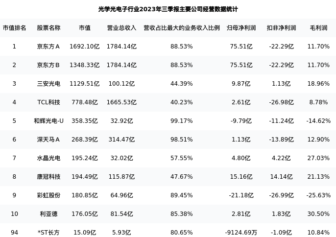 *ST长方最新报告期数据为三季报,下表汇总了光学光电子行业内市值靠前的公司三季报主要经营数据