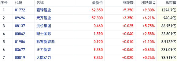 截至发稿,赣锋锂业(01772.HK)涨超9%,天齐锂业(09696.HK)涨逾6%,两大锂业龙头均再度刷新年内新高,月内涨幅已超两成。