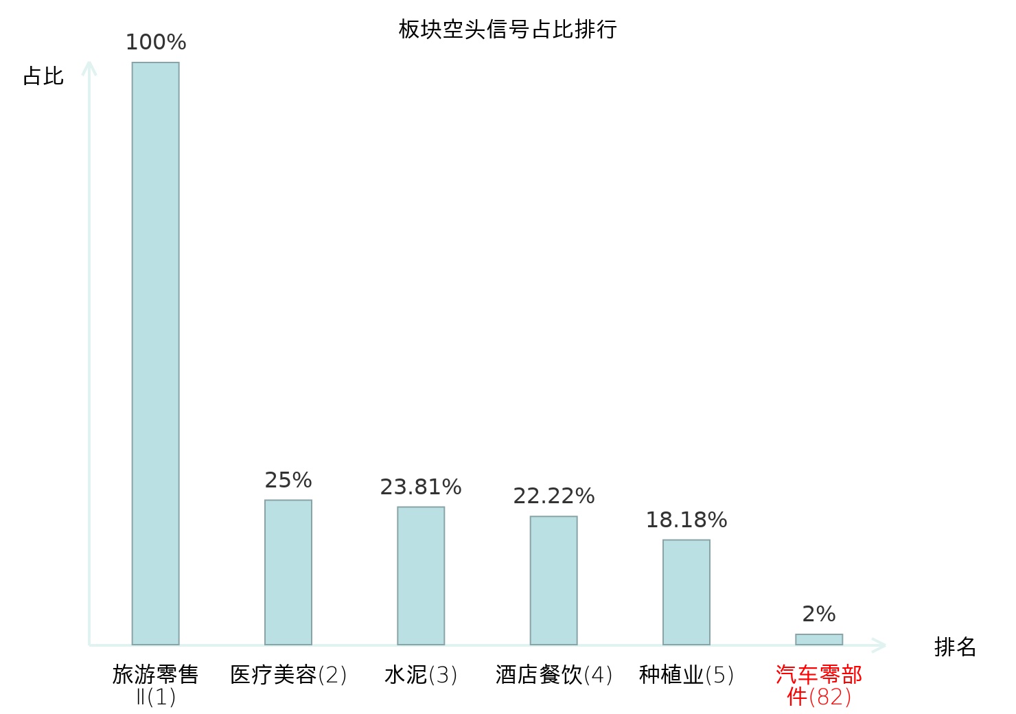 全市场所有行业板块中主力空头信号占比排名中,旅游零售Ⅱ板块位居第一。装修建材板块名次提升最快,较昨日上升112位。