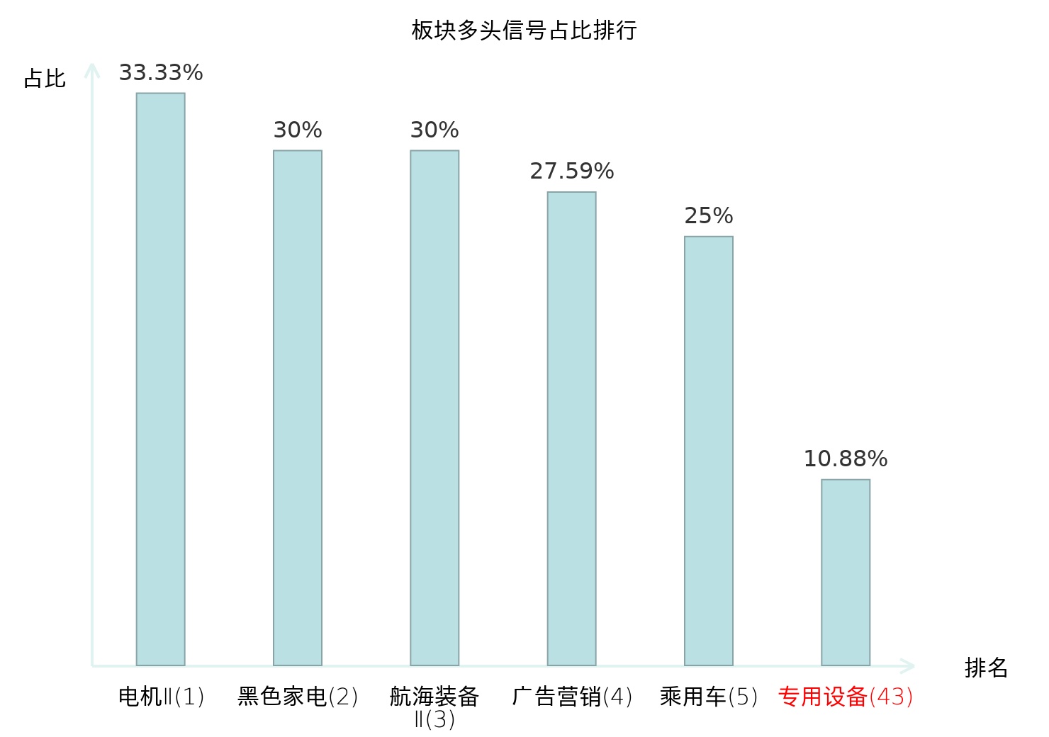 全市场所有行业板块中主力多头信号占比排名中,电机Ⅱ板块位居第一。乘用车板块名次提升最快,较昨日上升114位。