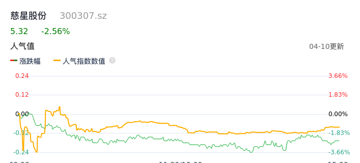 04月10日,慈星股份收报5.32,股价涨幅-2.56%,成交金额4463.46万元,换手率1.07%。