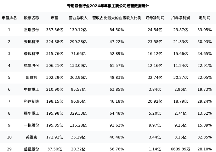 慈星股份最新报告期数据为年报,下表汇总了专用设备行业内市值靠前的公司年报主要经营数据